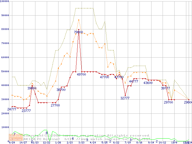 PC133 SDRAM DIMM CasLatency=3 ECC対応 Registeredタイプの最安値推移