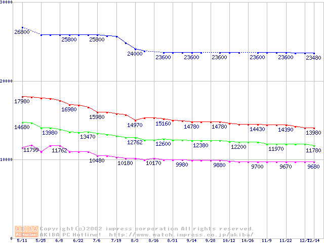| [↑前グラフ]: | Travelstar 40GNX (9.5mm,5400rpm,UltraATA/100,8MB,FDB,20GB/Platter)の最安値推移 |