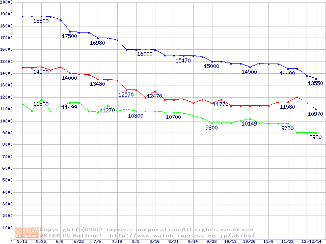 | [↑前グラフ]: | MKシリーズ (9.5mm,4200rpm,2MB,FDB,20GB/Platter)の最安値推移 |