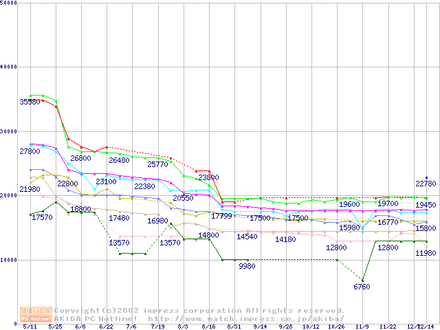 | [↑前グラフ]: | Socket A (OPGA,FSB 266MHz,L2 256KB,Thoroughbred)の最安値推移 |