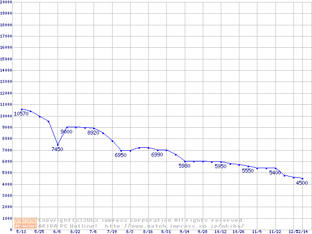 | Socket A (PGA,FSB 200MHz,L2 256KB,Thunderbird)の最安値推移 |