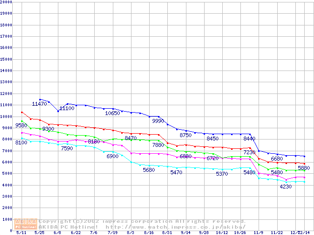 | [↑前グラフ]: | Socket 478 (micro-PGA,FSB 400MHz,L2 128KB,Willamette)の最安値推移 |