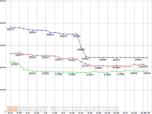 | [↑前グラフ]: | Socket 603 (micro-PGA,FSB 400MHz,L2 512KB,Prestonia)の最安値推移 |