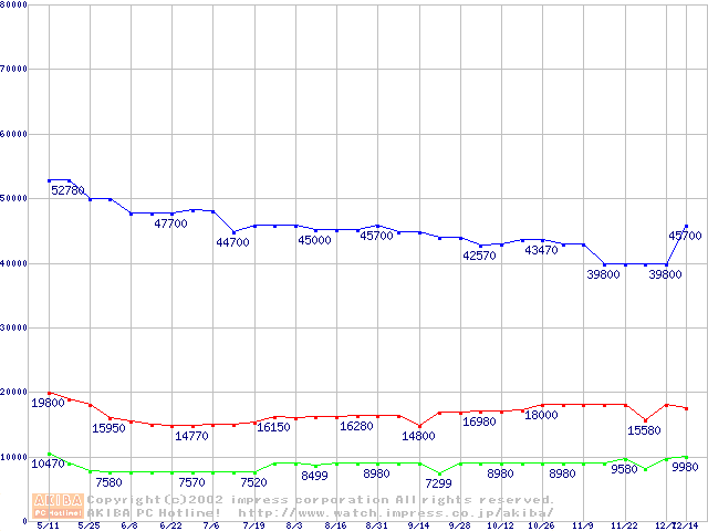 | [↓次グラフ]: | PC2100(DDR266) DDR SDRAM DIMM(CL 2.0) ECC対応 Registeredタイプの最安値推移 |