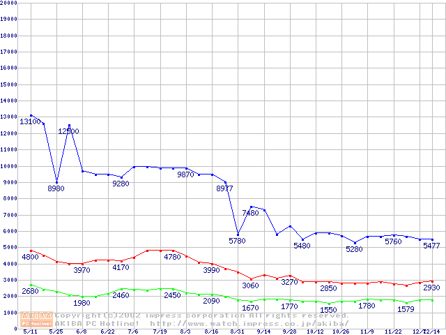 | [↑前グラフ]: | PC133 SDRAM DIMM CasLatency=3 ECC対応 Registeredタイプの最安値推移 |
