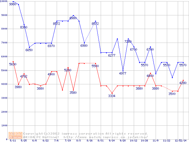 | [↑前グラフ]: | PC100 SDRAM DIMM CasLatency=2の最安値推移 |