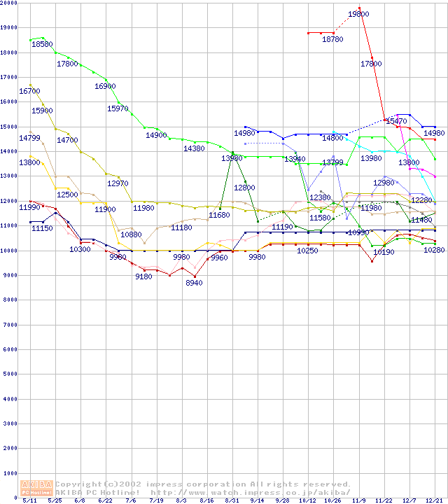 HDD主要製品(最安値1万5千円~2万円未満)の最安値推移