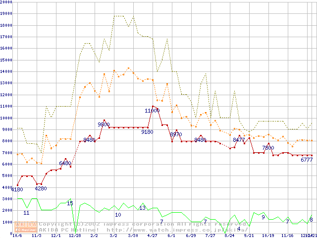 PC133 SDRAM DIMM CasLatency=3 ECC対応 Registeredタイプの最安値推移