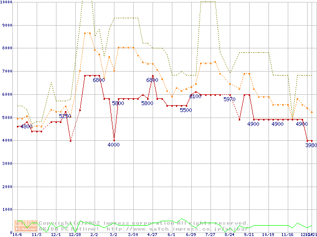 PC100 SDRAM DIMM CasLatency=2 ECC対応 Registeredタイプの最安値推移