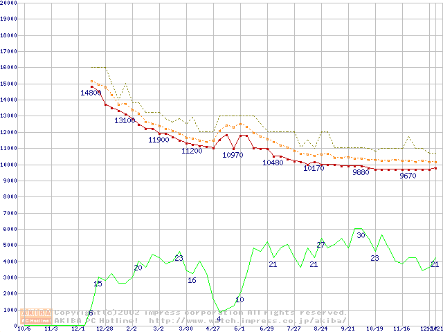 Travelstar 40GN (9.5mm,4200rpm,UltraATA/100,2MB,FDB,20GB/Platter)の最安値推移