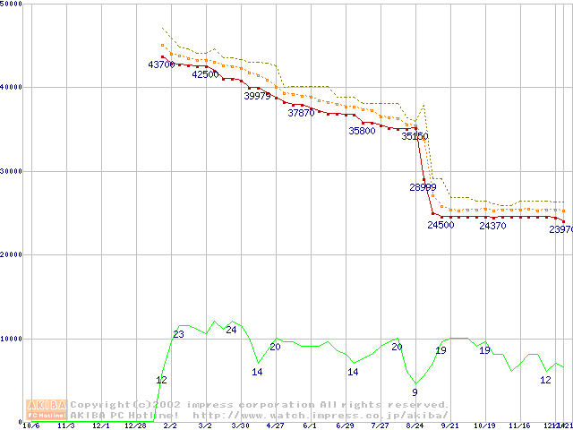 Socket 370 (FC-PGA2,FSB 133MHz,L2 512KB)の最安値推移