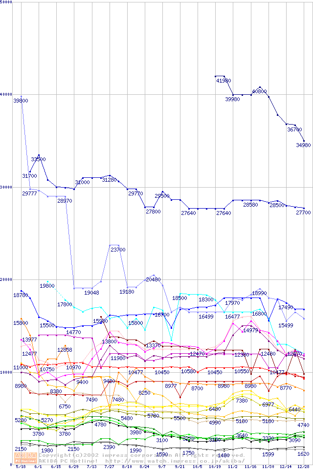 メモリ主要製品(最安値1万円以上)の最安値推移