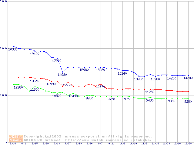 | [↑前グラフ]: | MHSシリーズ (9.5mm,4200rpm,UltraATA/100,2MB,FDB,30GB/Platter,FDB)の最安値推移 |