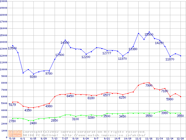 | [↓次グラフ]: | PC2100(DDR266) DDR SDRAM DIMM ECC対応 Registeredタイプの最安値推移 |
