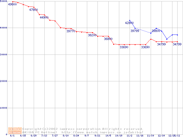 | 2.5インチHDD主要製品(最安値3万円以上)の最安値推移 |