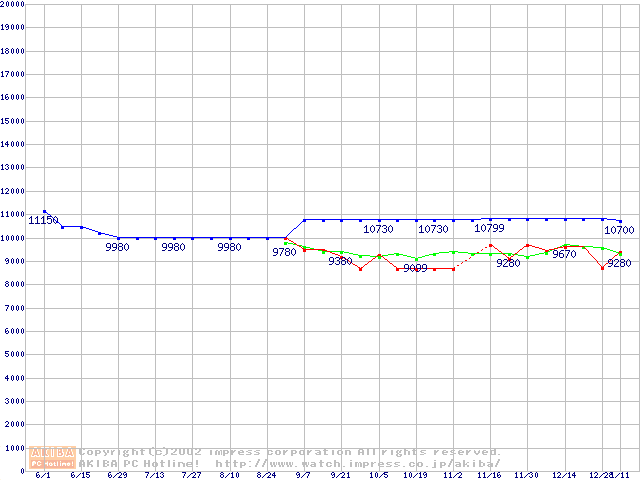 | [↑前グラフ]: | HDD 40GB~50GB未満(5400rpmクラス)の最安値推移 |