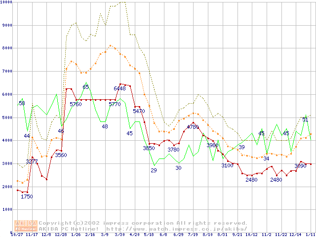 メモリ主要製品(最安値5千円未満)の最安値推移