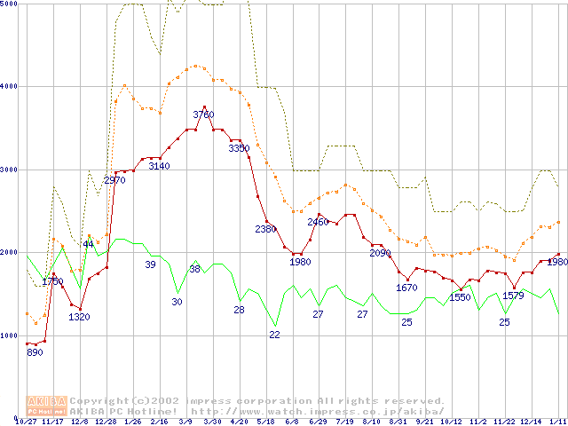 PC100 SDRAM DIMM CasLatency=2の最安値推移