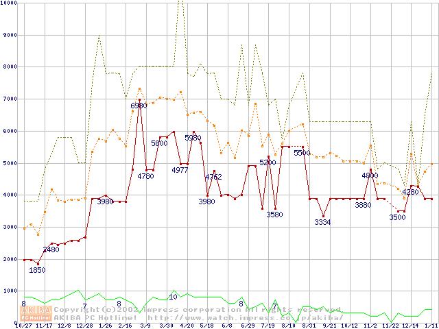 PC100 SDRAM DIMM CasLatency=2 ECC対応の最安値推移