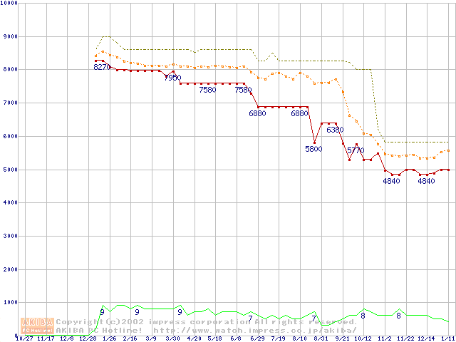 Socket 370 (PGA,FSB 100MHz,L2 64KB)の最安値推移