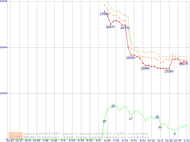 Socket A (OPGA,FSB 266MHz,L2 256KB,Thoroughbred)の最安値推移
