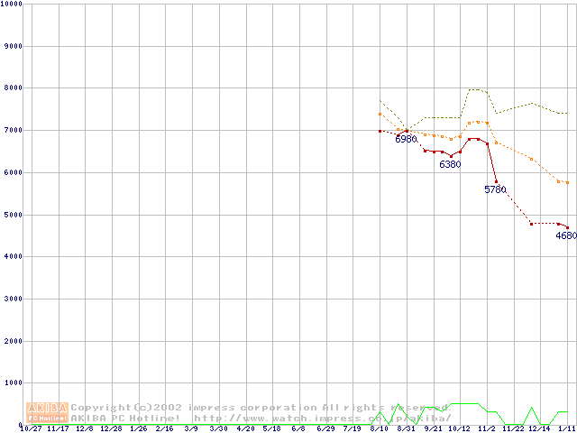 Socket 370 (FC-PGA,FSB 100MHz,L2 128KB,Coppermine)の最安値推移