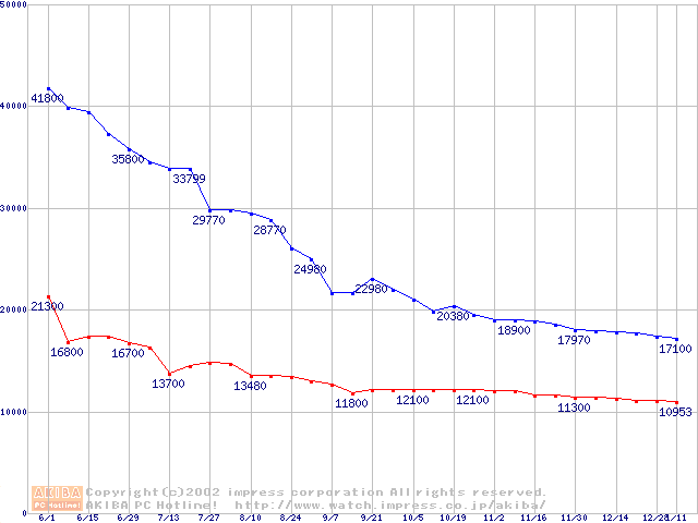 | [↑前グラフ]: | Travelstar 60GH (12.5mm,5400rpm,UltraATA/100,2MB,FDB,15GB/Platter)の最安値推移 |