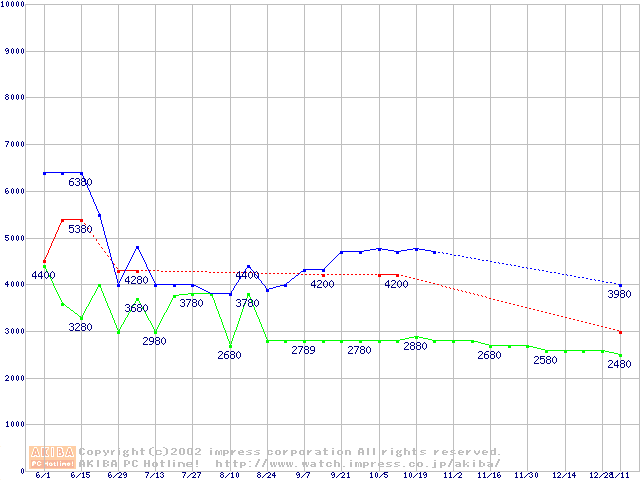 | [↑前グラフ]: | Socket A (PGA,FSB 200MHz,L2 64KB,Spitfire)の最安値推移 |