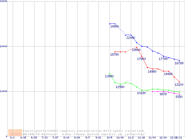 | [↑前グラフ]: | Deskstar 180GXP (7200rpm,8MB,UltraATA/100,FDB)の最安値推移 |