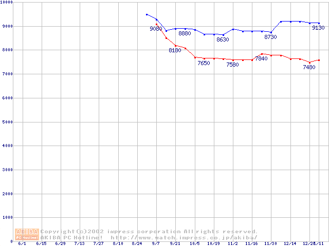 | [↑前グラフ]: | DiamondMax Plus 9 (7200rpm,2MB,UltraATA/133,FDB)の最安値推移 |
