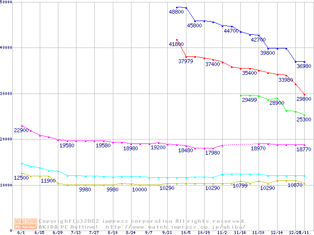 | [↓次グラフ]: | WD Caviar (7200rpm,UltraATA/100,20GB/Platter)の最安値推移 |
