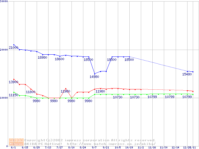 | [↑前グラフ]: | WD Caviar (7200rpm,UltraATA/100,20GB/Platter)の最安値推移 |