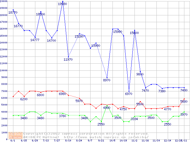 | [↑前グラフ]: | PC133 SDRAM DIMM CasLatency=2の最安値推移 |