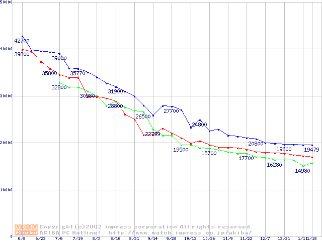 | [↓次グラフ]: | 2.5インチHDD主要製品(最安値2万円~3万円未満)の最安値推移 |