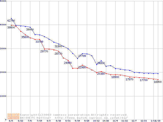 | [↑前グラフ]: | 2.5インチHDD 40GB~50GB未満(9.5mm厚,4200rpm)の最安値推移 |