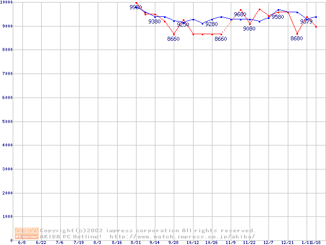 | [↓次グラフ]: | HDD 80GB~100GB未満(5400rpmクラス)の最安値推移 |