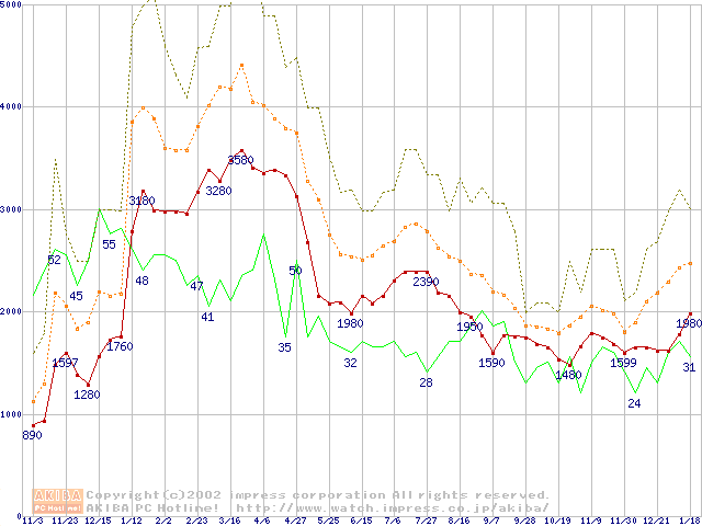 PC133 SDRAM DIMM CasLatency=3の最安値推移