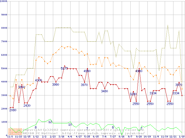 PC133 SDRAM DIMM CasLatency=3 ECC対応の最安値推移