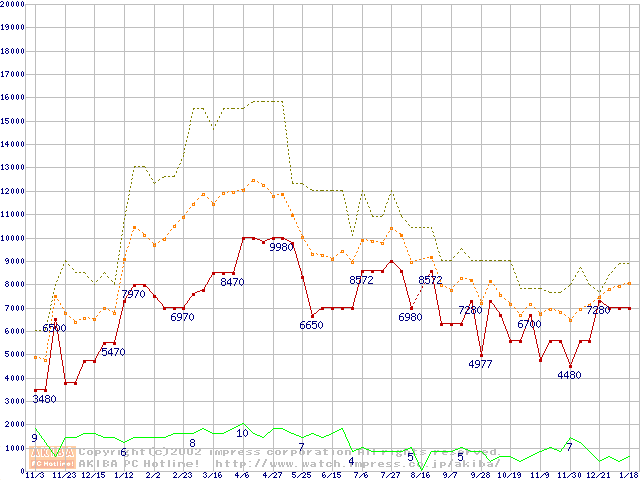 PC100 SDRAM DIMM CasLatency=2 ECC対応の最安値推移