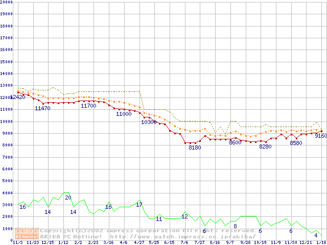 WD Caviar (7200rpm,UltraATA/100,20GB/Platter)の最安値推移