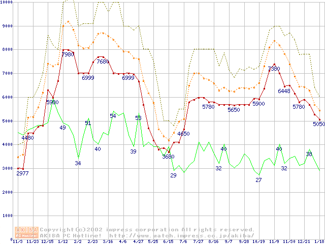 メモリ主要製品(最安値5千円~1万円未満)の最安値推移