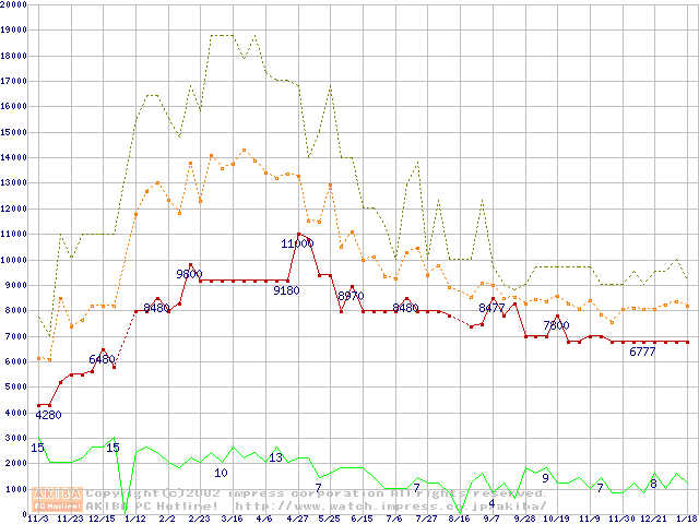 PC133 SDRAM DIMM CasLatency=3 ECC対応 Registeredタイプの最安値推移