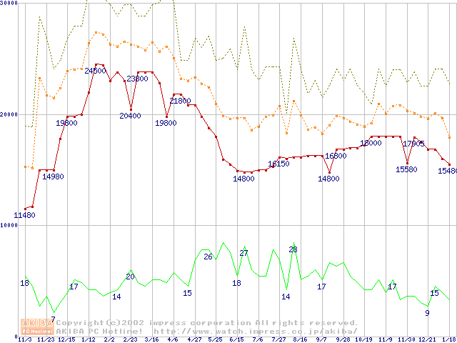 メモリ主要製品(最安値1万円以上)の最安値推移