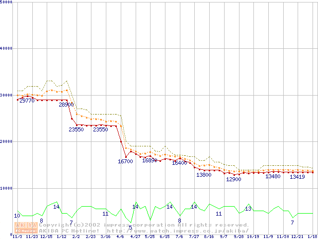 Socket 370 (FC-PGA2,FSB 133MHz,L2 256KB,Tualatin)の最安値推移