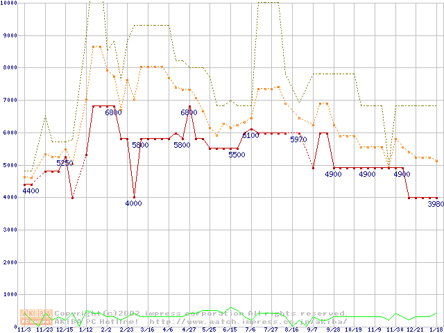 PC100 SDRAM DIMM CasLatency=2 ECC対応 Registeredタイプの最安値推移