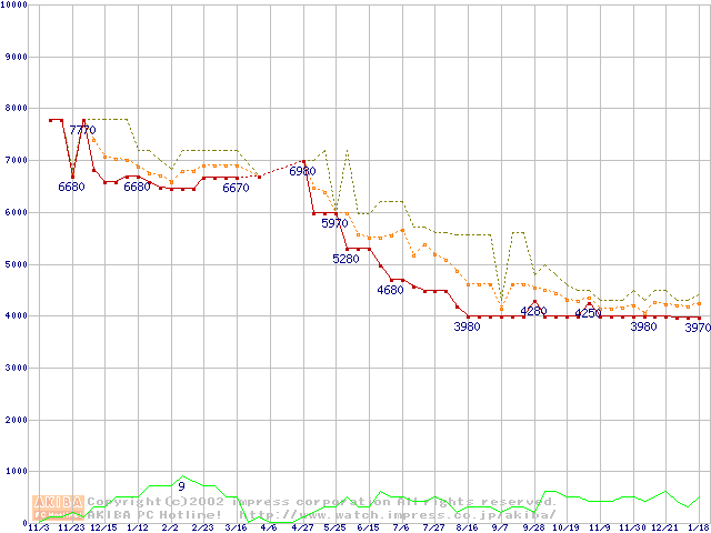 Socket 370 (PGA,FSB 133MHz,L2 64KB)の最安値推移