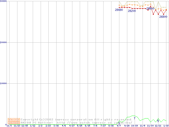 DK23EAシリーズ (9.5mm,4200rpm,2MB,FDB,30GB/Platter)の最安値推移