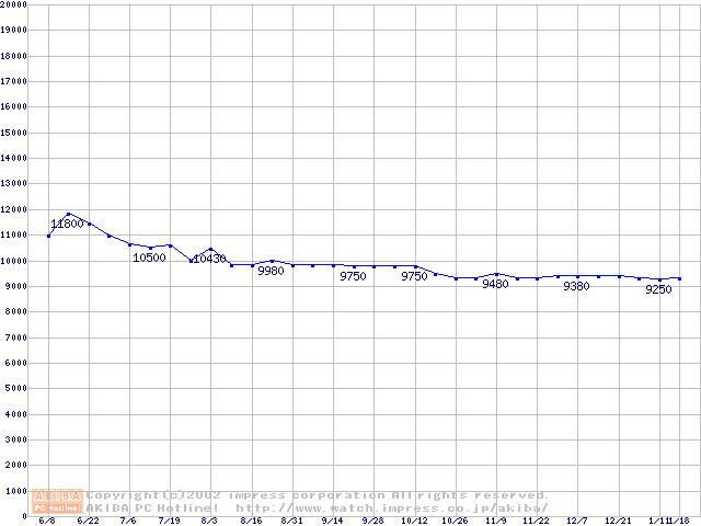 | [↑前グラフ]: | MHSシリーズ (9.5mm,4200rpm,UltraATA/100,2MB,FDB,30GB/Platter,FDB)の最安値推移 |