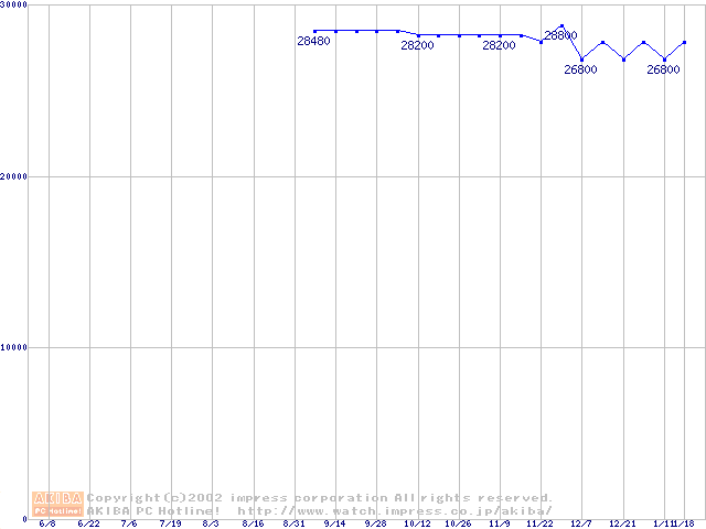 | [↑前グラフ]: | MHRシリーズ (9.5mm,4200rpm,UltraATA/100,2MB,FDB,20GB/Platter)の最安値推移 |