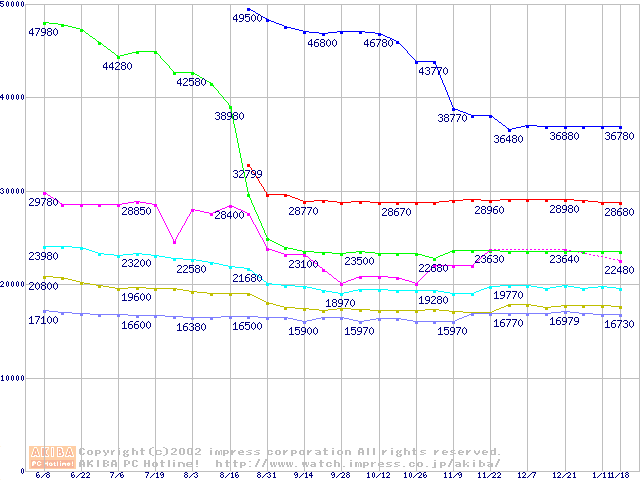| [↑前グラフ]: | Socket 478 (micro-PGA,FSB 533MHz,L2 512KB,Northwood)の最安値推移 |